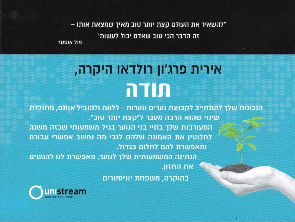 אנחנו ב”מרעיון למוצר” רואים בתרומה לקהילה חשיבות עליונה.הצטרפנו לעמותת יוניסטרים שהוקמה על ידי רוני צארום, כדי לשנות את פני החברה במדינת ישראל ולהעניק לבני נוער מהפריפריה, אשר אינם חשופים למעגל ההצלחה הקיים במרכז הארץ, את ההזדמנות להצליח ולממש את הפוטנציאל הטמון בהם.